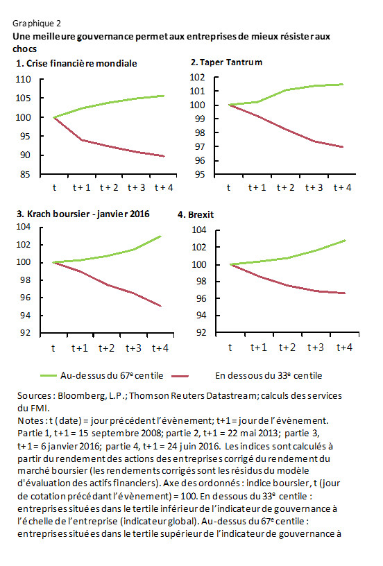 En outre, les entreprises mal gouvernées voient le cours de leurs actions baisser plus fortement en cas de turbulences sur les marchés financiers, comme au moment du référendum britannique sur le Brexit (graphique 2).