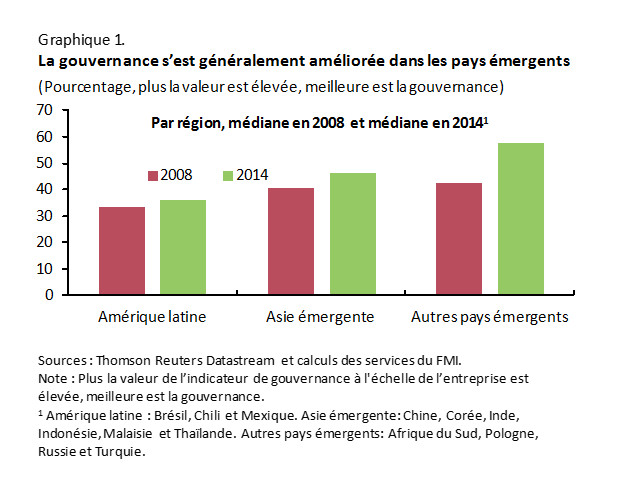 Le FMI a mis au point un nouvel indicateur de gouvernance à l’échelle de l’entreprise qui montre que les entreprises des pays émergents hors Amérique latine et Asie émergente ont fait le plus de progrès depuis 2008 (graphique 1). Cela dit, il existe d’importantes différences entre pays émergents et de nouvelles améliorations sont possibles. À l’échelle du pays, les indicateurs calculés par d’autres institutions indiquent que la protection des investisseurs, le respect des droits de propriété, les règles de publicité tout comme les normes en matière d’audit et d’information pourraient être renforcées dans la plupart des pays émergents.