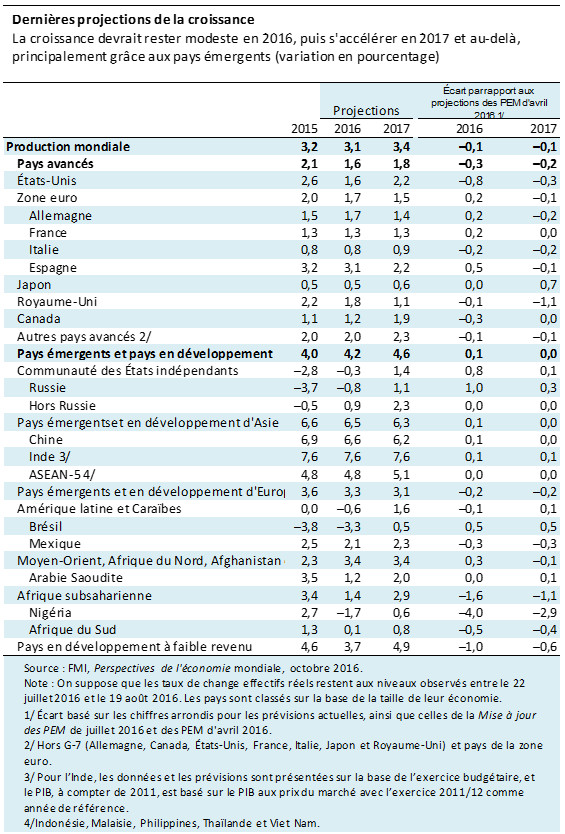 La croissance économique mondiale restera modérée cette année à la suite d’un ralentissement aux États-Unis et du vote en faveur de la sortie du Royaume-Uni de l'Union européenne, note le FMI dans son rapport d'octobre 2016 sur les Perspectives de l’économie mondiale qui est publié aujourd’hui. L’institution prévoit un léger rebond en 2017 et au-delà, principalement grâce aux pays émergents.