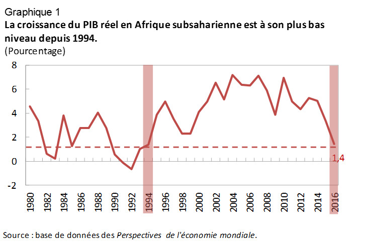 D’après les projections de ce rapport, le taux de croissance moyen devrait tomber à 1.4 % en 2016 (graphique 1), niveau inférieur à la moitié de celui de l’année précédente et très loin des 5 % enregistrés sur la période 2010–14. Toujours selon le rapport, le PIB par habitant devrait aussi se contracter pour la première fois depuis 22 ans.