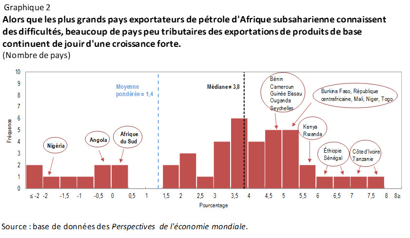 Les pays peu tributaires des exportations de produits de base, qui représentent environ la moitié des pays de la région, continuent d’enregistrer de bons résultats et affichent des taux de croissance d’au moins 4 %. Ces pays bénéficient de la diminution de leur facture pétrolière, de l’amélioration du climat des affaires et du niveau élevé des investissements d’infrastructure. Ainsi, des pays tels que la Côte d’Ivoire, l’Éthiopie, le Sénégal et la Tanzanie devraient encore enregistrer des taux de croissance de plus de 6 % au cours des deux prochaines années.