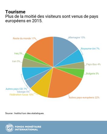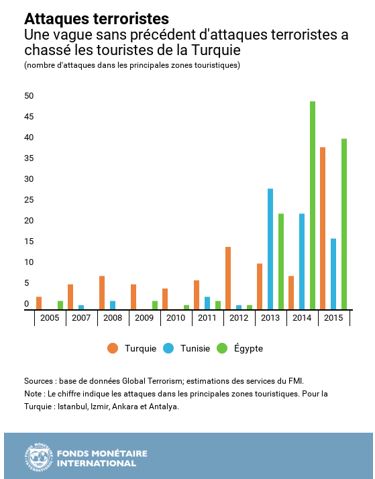 Le secteur du tourisme en Turquie, autrefois en pleine expansion, a été gravement touché à la suite d’une série d’attaques terroristes et de turbulences politiques internes. Le recul du nombre de visiteurs a touché des secteurs connexes, et a amputé d’environ 1 point la croissance du PIB national en 2016, selon une étude récente du FMI.