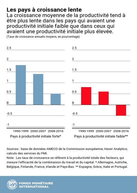Cette hétérogénéité est intimement liée au ralentissement de la croissance de la productivité dans les pays qui avaient initialement des revenus plus faibles. Cela remet en question la promesse d’une hausse des revenus engendrée par une plus grande intégration économique, une des raisons d’être de l’union monétaire.