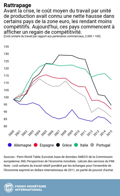 Ces pays doivent toutefois consentir plus d’efforts pour combler la perte de compétitivité qu’ils avaient accusé avant la crise. Aujourd’hui ce travail ne doit pas se centrer sur des réductions d’effectifs mais plutôt sur une plus forte productivité, notamment à travers l’investissement et des méthodes de travail plus efficientes ainsi que sur une réforme des mécanismes de négociation salariale. En plus du rétablissement de la compétitivité, ces mesures permettraient de relever le taux d’emploi et, à terme, d’améliorer les niveaux de vie.