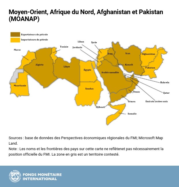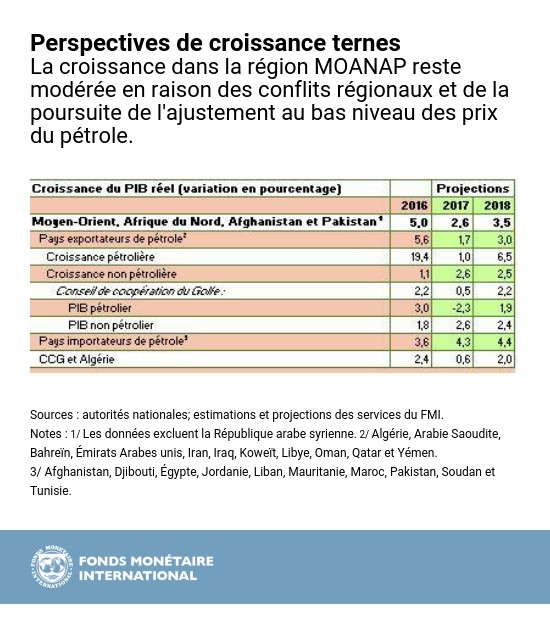 Les perspectives économiques de la région du Moyen-Orient, de l’Afrique du Nord, de l’Afghanistan et du Pakistan (MOANAP) restent ternes principalement en raison de la poursuite de l’ajustement au bas niveau des prix du pétrole et des conflits régionaux, note le FMI dans son dernier rapport sur les Perspectives économiques régionales de la région MOANAP. Les pays de la région doivent profiter de la reprise actuelle de la croissance mondiale pour assainir leurs finances publiques, accélérer des réformes riches en emplois et diversifier leur économie.