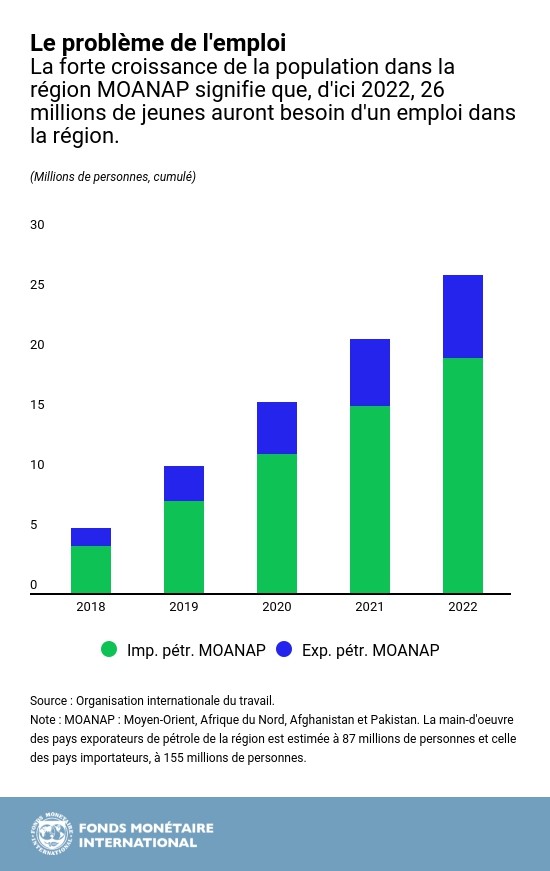 Tous les pays de la région MOANAP devraient profiter de l’occasion offerte par l’affermissement de la reprise mondiale pour mettre en œuvre des réformes riches en emplois. Ces pays ont besoin de telles réformes pour s’attaquer à leur chômage déjà élevé et absorber les 26 millions de jeunes qui devraient arriver sur le marché du travail d’ici 2022. Les pouvoirs publics peuvent jouer un rôle important dans le développement du secteur privé en améliorant le climat des affaires, en renforçant la transparence et la responsabilisation des institutions publiques, et en améliorant l’accès au crédit. Il est important aussi d’améliorer l’éducation de manière à mieux faire correspondre les qualifications des travailleurs et les besoins du marché, ainsi que d’encourager la libre circulation de la main-d’œuvre. Par ailleurs, il convient de maintenir les dispositifs de sécurité sociale afin de protéger les groupes vulnérables de la société.