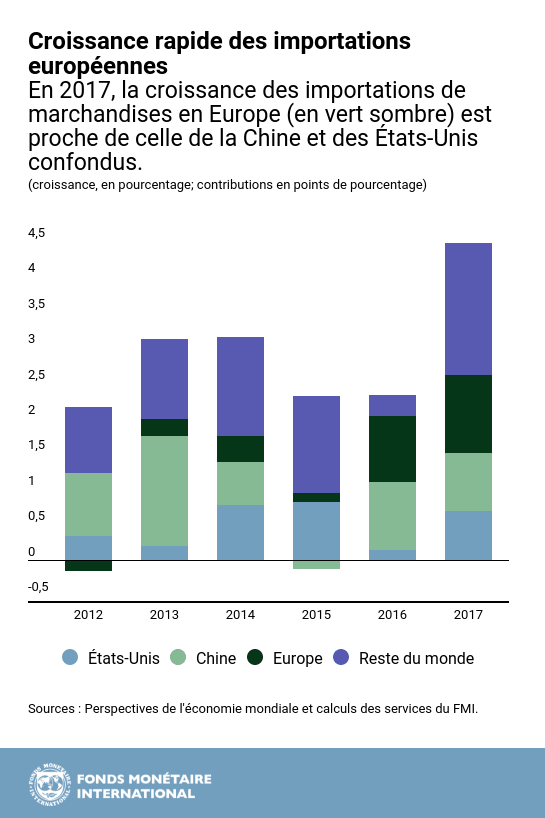La croissance européenne a été essentiellement tirée par la demande intérieure, notamment une hausse de l’investissement. Elle s’étend maintenant au reste du monde à travers le commerce extérieur : la contribution de l’Europe à la croissance des importations mondiales de marchandises en 2016-17 est comparable à celle de la Chine et des États-Unis confondus.