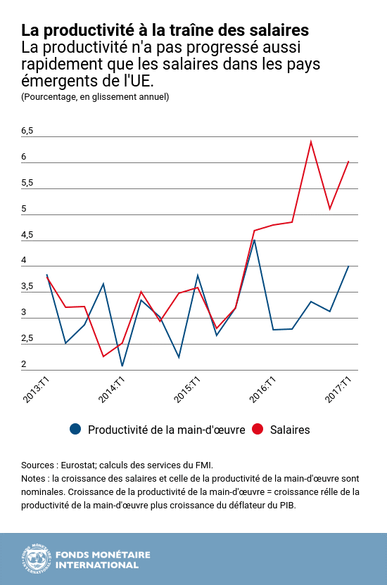 Grâce à cette croissance généralisée, le chômage est en recul dans l’ensemble du continent. Au cours des dernières années, les salaires ont progressé lentement dans bien des pays plus riches, mais fortement en Europe centrale et du Sud-Est, surtout dans le secteur des services. Or, dans ces pays, la croissance de la productivité n’est pas allée de pair avec celle des salaires ces deux dernières années. Cette tendance pourrait à la longue écorner l’avantage compétitif de l’Europe émergente.