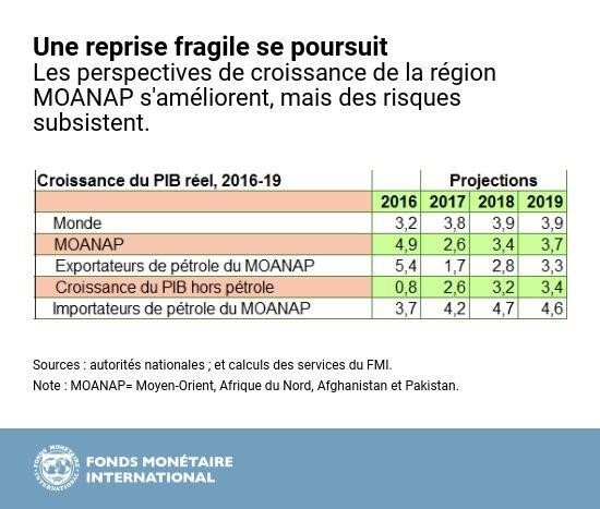La croissance hors pétrole s’accélère dans les pays exportateurs de pétrole, tandis qu’une reprise fragile se poursuit dans les pays importateurs de pétrole de la région Moyen-Orient, Afrique du Nord, Afghanistan et Pakistan (MOANAP), note le FMI dans son dernier rapport sur les Perspectives économiques régionales.