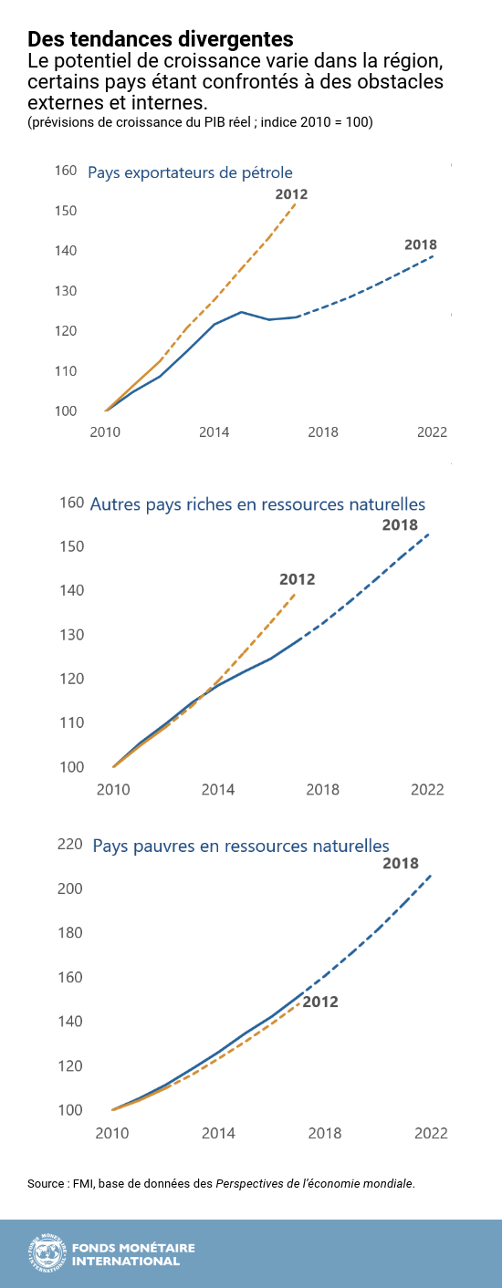 Les résultats et perspectives économiques sont très différents d’un pays à l’autre. Les pays exportateurs de pétrole sont encore aux prises avec les séquelles de la plus forte chute des prix réels du pétrole depuis 1970, et leur croissance est bien en deçà des tendances antérieures. Plusieurs autres pays, dont des pays riches ou pauvres en ressources naturelles et des pays fragiles, maintiennent un taux de croissance de 6 % ou plus, alors que d’autres sont en proie à des conflits internes qui se traduisent par un grand nombre de réfugiés et de personnes déplacées. L’économie de l’Afrique du Sud et du Nigéria, les deux poids lourds de la région, tourne en dessous de la normale, ce qui pèse fortement sur la croissance régionale.