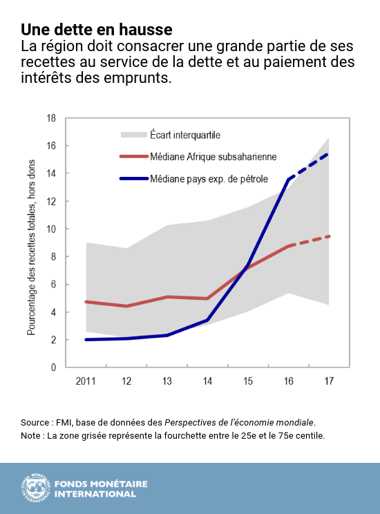 Le niveau de la dette publique a augmenté dans la région : sur les 35 pays à faible revenu de la région, 15 sont aujourd’hui surendettés ou présentent un risque élevé de le devenir. Les paiements d’intérêts ont également augmenté, absorbant une part croissante des recettes : dans la région, les paiements d’intérêts médians ont doublé entre 2014 et 2017, passant de 5 % à 10 % des recettes.
