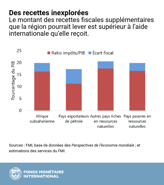 Malgré des avancées considérables dans la mobilisation des recettes au cours des 20 dernières années, l’Afrique subsaharienne présente le ratio recettes-PIB le plus faible, avec un niveau médian de 18 % en 2016, soit cinq points de pourcentage de moins que les autres pays émergents ou en développement. La plupart des pays de la région pourraient lever des recettes beaucoup plus importantes. Selon le rapport, les pays d’Afrique subsaharienne pourraient en moyenne accroître leurs recettes fiscales à hauteur de 3 à 5 % du PIB (graphique 3), soit un montant largement supérieur à l’aide internationale que la région reçoit chaque année.