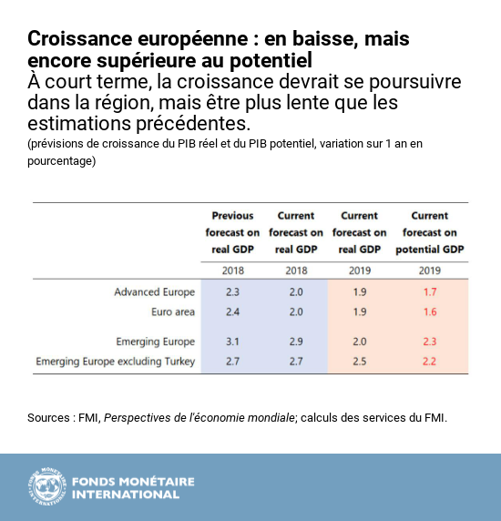 5. Perspectives. Par rapport à la prévision précédente du Fonds monétaire international, la croissance a été révisée à la baisse dans environ la moitié des pays européens. Cela s’explique par l’affaiblissement de la demande extérieure et la hausse des prix de l’énergie. Néanmoins, la croissance devrait rester supérieure à son potentiel dans la plupart des pays de la région.