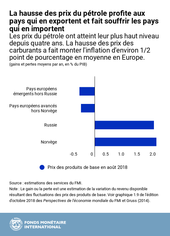 3. Des revenus qui souffrent de la hausse des prix du pétrole. Au cours de l’année écoulée, les prix de l’énergie, y compris du pétrole, ont augmenté. Les prix des produits de base ont progressé de 7 % depuis le printemps 2018, tandis que les prix du pétrole ont grimpé à environ 80 dollars le baril en septembre 2018. En conséquence, les revenus disponibles réels ont diminué, en moyenne, de 0,5 point de pourcentage du PIB dans la majeure partie de l’Europe. Cependant, les pays producteurs de pétrole, la Norvège et la Russie, ont profité de cette évolution.