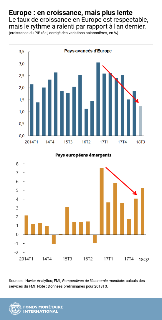 L’expansion s’est poursuivie en Europe au premier semestre 2018, quoique plus lentement que prévu, surtout dans les pays avancés. Portée par la demande intérieure, l’activité économique a continué de s’accélérer au premier semestre 2018, note le FMI dans son dernier bilan de santé de l’économie européenne. Mais les perspectives sont moins favorables : plusieurs forces freineront probablement la croissance.