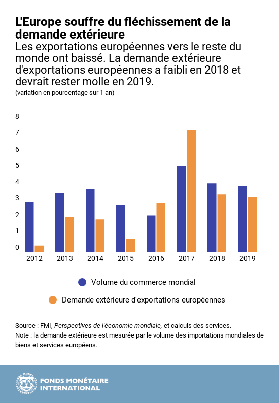 1. Une croissance inférieure aux prévisions. L’Europe a connu une croissance vigoureuse au cours des deux dernières années car de nombreux risques ne se sont pas matérialisés. La région continue d’enregistrer une croissance respectable qui est alimentée par la demande intérieure, elle-même portée par le niveau élevé de l’emploi et des salaires. Néanmoins, l’expansion a été inférieure aux prévisions. Il est maintenant prévu que la croissance tombera de 2,8 % en 2017 à 2,3 % en 2018 et à 1,9% en 2019.