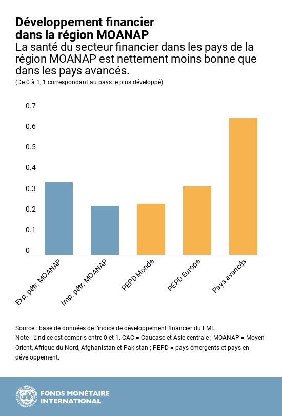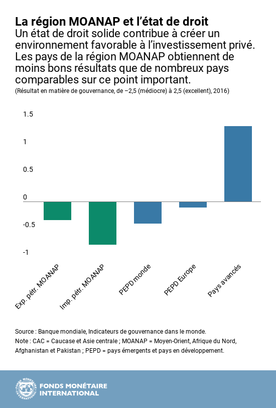 Cela n’est pas seulement un enjeu pour les pays importateurs de pétrole de la région. Les pays exportateurs de pétrole plus riches se classent derrière les pays avancés comparables selon divers indicateurs de gouvernance et de développement financier. Un développement financier plus poussé, qui se situerait au niveau du pays avancé moyen, pourrait en particulier générer un surcroît d’investissement privé de près de 2 points de pourcentage du PIB.
