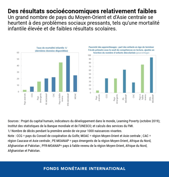 Les indicateurs d’éducation, de santé et de pauvreté au Moyen-Orient et en Asie centrale se sont sensiblement améliorés ces vingt dernières années. Toutefois, le taux de progression a baissé et ces indicateurs restent plus faibles que dans les pays comparables. Le niveau des dépenses sociales est lui aussi plus faible, bien que dans une moindre mesure.