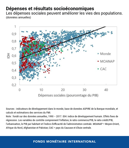 La pandémie de COVID-19 a mis en évidence le besoin urgent d’améliorer les résultats socioéconomiques. Il ressort de notre nouvelle étude que l’accroissement des dépenses sociales et de leur efficience (obtenir plus que ce qui a été investi) peut jouer un rôle important. Cela repose avant tout sur le renforcement des institutions et l’amélioration de la gouvernance et de la transparence. Nos principales conclusions sont résumées dans les six graphiques ci-dessous.