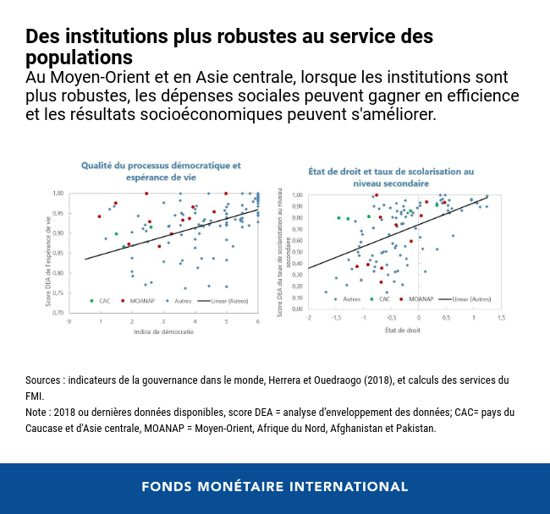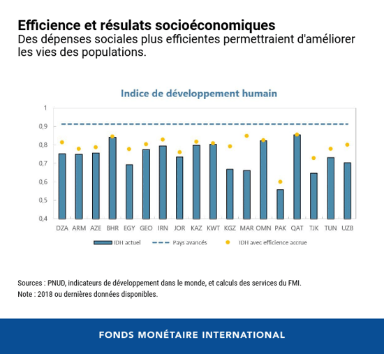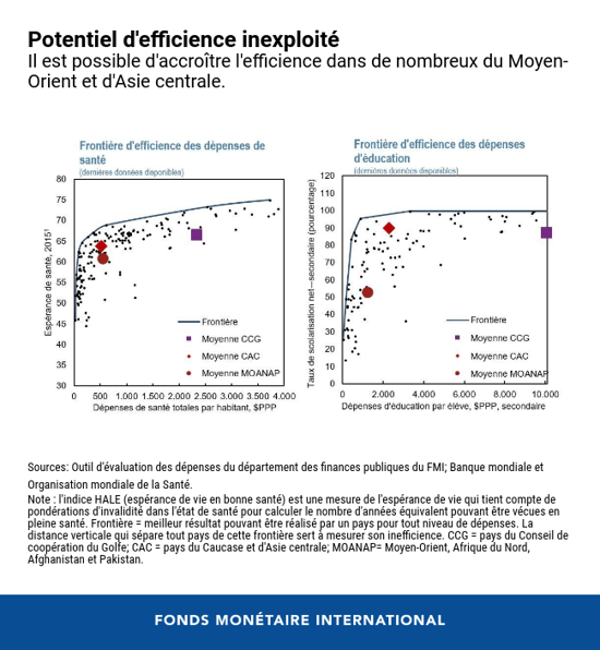 • L’efficience des dépenses sociales est relativement faible au Moyen-Orient et en Asie centrale. Les pays de la région possèdent une marge d’amélioration pour accroître l’efficience des dépenses sociales sur le plan de l’amélioration des résultats socioéconomiques.