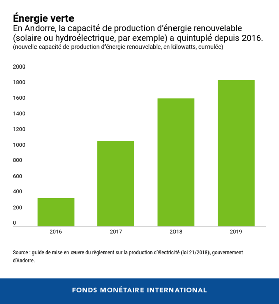 - L'Andorre est résolue à assurer la durabilité environnementale. Le pays a multiplié par cinq sa production d'énergies renouvelables depuis 2016. Bien que ses efforts se concentrent désormais sur le transport et le chauffage, qui sont les principales sources d'émissions du pays, le gouvernement a également fixé des objectifs à long terme pour réduire la dépendance énergétique et augmenter la production d'énergies renouvelables d'ici à 2030 et atteindre la neutralité carbone d'ici à 2050.
