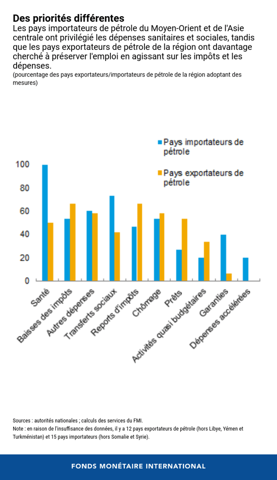 - Les pays ont appliqué diverses mesures budgétaires pour lutter contre la pandémie. Il a fallu agir rapidement compte tenu du caractère sans précédent de la crise. Les pays importateurs de pétrole de la région Moyen-Orient et Asie centrale ont en priorité augmenté les dépenses de santé et les transferts sociaux ciblés. Les pays exportateurs de pétrole ont quant à eux privilégié des réductions d’impôts temporaires, des moratoires fiscaux et une hausse d’autres dépenses, par exemple au titre du versement partiel des salaires pour préserver l’emploi.