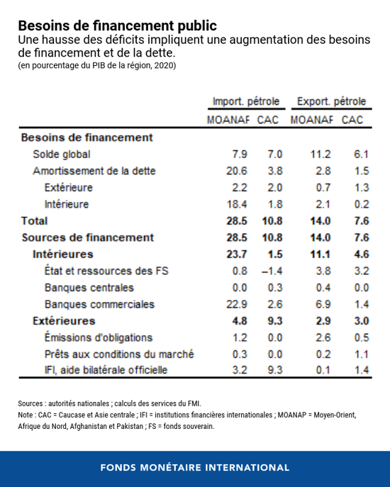 - Le creusement des déficits implique une hausse des besoins de financement. Compte tenu du creusement des déficits, les besoins de financement médians de la région devraient augmenter de plus de 4 % du PIB sous l’effet de la pandémie. Cela portera le total des besoins de financement public prévus à 613 milliards de dollars cette année ; ils seront ramenés à 571 milliards de dollars en 2021. Les besoins de la région MOANAP seront plus importants que ceux de la région Caucase et Asie centrale (CAC), de même pour ceux des pays importateurs de pétrole par rapport aux pays exportateurs de pétrole. Les pays de la région MOANAP devraient aussi s’appuyer davantage sur les ressources intérieures, alors que ceux de la région CAC sont plus tributaires de financements extérieurs.
