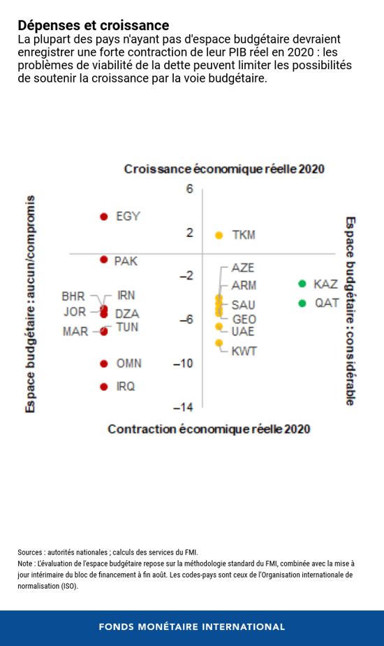 - L’accroissement de la dette provoquera une érosion de l’espace budgétaire et une accentuation des risques budgétaires. Au début de la crise, de nombreux pays de la région, en particulier les pays importateurs de pétrole de la région MOANAP, disposaient déjà d’un espace budgétaire très restreint voire inexistant. Les effets conjugués de l’accroissement de la dette, des gros besoins de financement et de la difficulté à procéder à un rééquilibrage budgétaire limiteront leur capacité à stimuler la reprise.