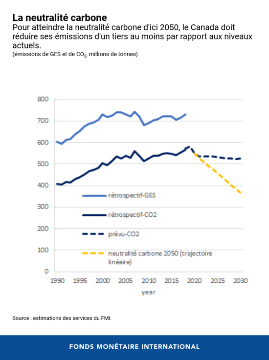 - La stratégie d’atténuation du Canada repose sur le Cadre pancanadien sur la croissance propre et les changements climatiques. Sans ce cadre, le Canada serait le dixième plus gros émetteur de gaz à effet de serre en valeur absolue en 2030. Pour atteindre son objectif de neutralité carbone, le Canada doit réduire ses émissions d'un tiers par rapport aux niveaux actuels d’ici 2030 et de deux tiers d’ici 2040.