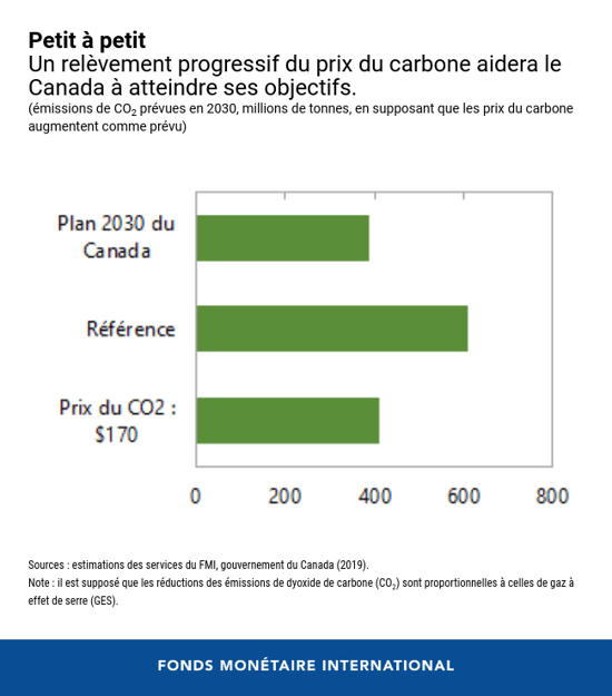- Le filet de sécurité de soutien permet aux provinces et territoires de mettre en place leur propre système, mais établit aussi un prix « plancher » du carbone. Ce prix passera progressivement de 40 dollars canadiens la tonne en 2021 à 170 dollars canadiens la tonne d’ici 2030 : à l’échelle nationale, les émissions de dioxyde de carbone (CO2) seraient ainsi réduites d’environ 33 % par rapport à leurs niveaux du statu quo, ce qui correspond aux objectifs du pays.