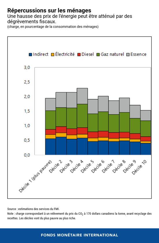 - La tarification du carbone peut avoir comme inconvénient une hausse des prix de l’énergie pour les ménages, en particulier ceux à plus bas revenu, qui consacrent une plus grande partie de leur revenu à l'énergie. Selon le plan actuel, la charge pour le ménage canadien moyen sera d'environ 2 % de la consommation en 2030. Le Canada résout ce problème en retournant les recettes tirées de la tarification du carbone aux ménages sous la forme d'un dégrèvement fiscal ou d’investissements, qui compensent environ 80 % de la charge. C'est particulièrement important à l’heure où le pays chercher à se sortir de la pandémie de COVID-19.