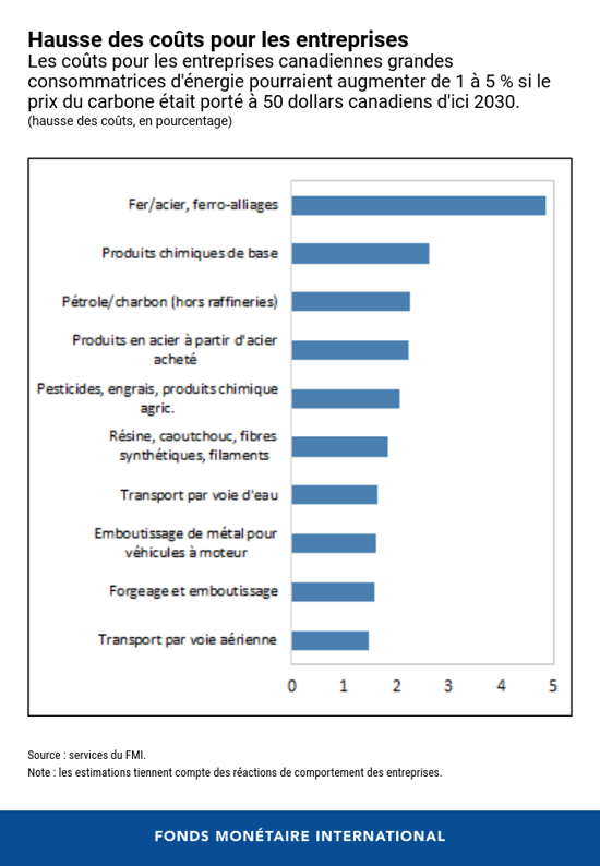 - Autre préoccupation : les répercussions de la tarification du carbone sur la compétitivité de l’industrie, en particulier pour les entreprises grandes consommatrices d'énergie qui opèrent sur les marchés mondiaux, par exemple dans les secteurs des métaux et des produits chimiques. Même un prix de 50 dollars canadiens accroîtrait les coûts de 1 à 5 %. Au Canada, ces entreprises sont tenues de réduire leurs émissions par unité de production, mais pas de payer des impôts sur leurs émissions restantes.