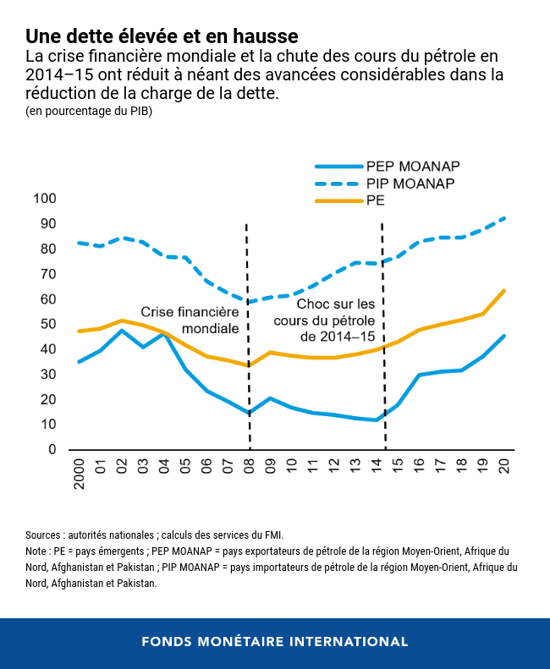 Face à la pandémie de COVID‑19, les pays de la région Moyen‑Orient, Afrique du Nord, Afghanistan et Pakistan (MOANAP) ont pris des mesures sans précédent en termes d’ampleur et d’urgence. Si cette réponse énergique a permis de sauver des vies et d’amortir le choc économique, elle a également exacerbé les facteurs de vulnérabilité liés à la dette et entraîné une forte hausse des besoins de financement.