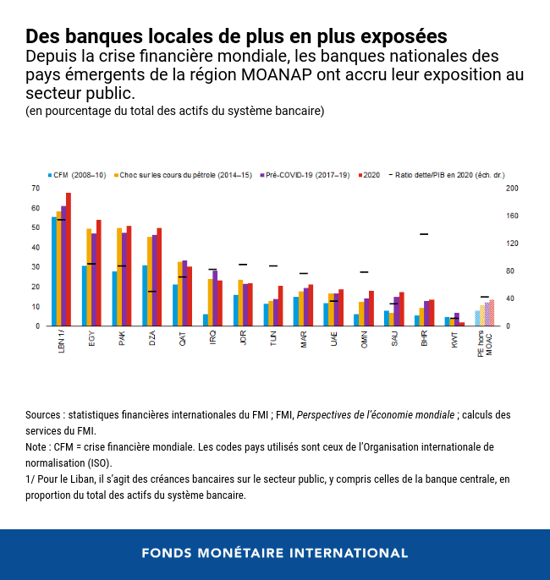 Ayant un accès limité au financement extérieur, les administrations et les grandes entreprises publiques se sont tournées vers les banques de leur pays. Aussi, le volume des prêts consentis par les banques au secteur public a augmenté dans plusieurs des pays émergents de la région MOANAP, dans une proportion allant de plus de 20 % du total des actifs des banques en Iraq, en Jordanie et au Qatar, à plus de 45 % en Algérie, en Égypte et au Pakistan, et jusqu’à 60 % au Liban. À titre de comparaison, l’exposition des banques de pays émergents au secteur public était de 12 % dans les autres régions.