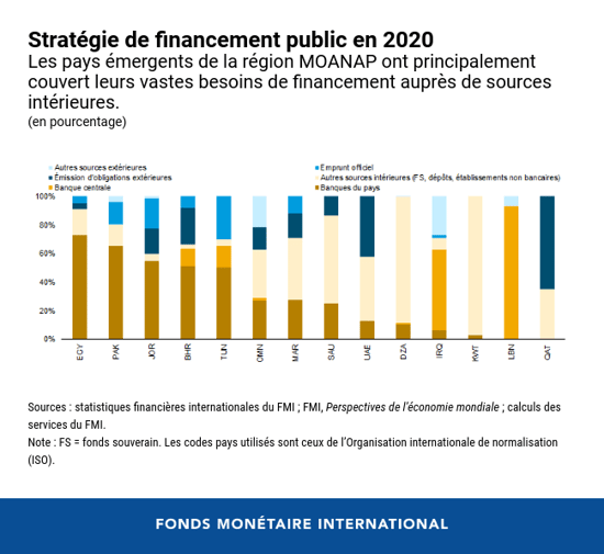émergents dans le monde, les financements nationaux ont joué un rôle essentiel, en particulier durant la première phase de la crise, lorsque les marchés internationaux étaient perturbés. Par exemple, l’Égypte, la Jordanie, le Pakistan et la Tunisie ont couvert plus de 50 % de leurs besoins bruts de financement public grâce à des financements octroyés par le secteur bancaire national en 2020.