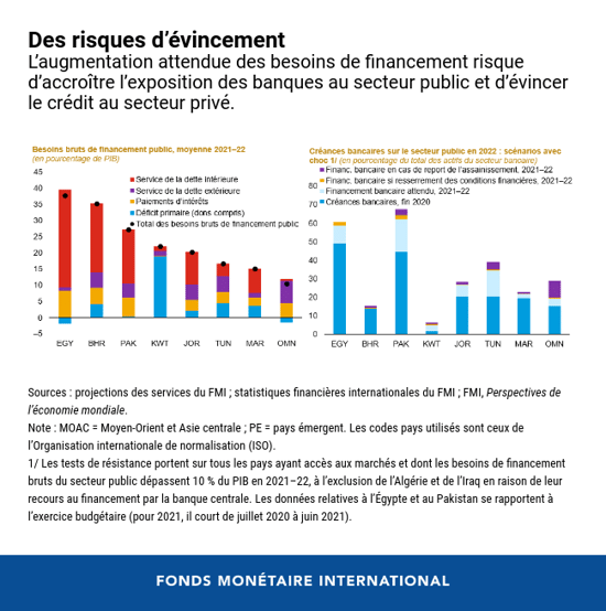 Sachant que la possibilité de recourir intensément aux marchés internationaux devrait rester limitée, il est probable que l’exposition des banques au secteur public s’accélère dans les années à venir, ce qui pourrait évincer le crédit au secteur privé à un moment où le financement privé est impératif pour stimuler la reprise. En outre, selon les Perspectives économiques régionales, les besoins budgétaires pourraient augmenter encore de 3 % du PIB dans un scénario de choc potentiel supposant un resserrement rapide des conditions financières mondiales et un retard dans le rééquilibrage des finances publiques dû à la lenteur de la reprise. Si les banques locales financent ces besoins inopinés, en plus des ressources nécessaires en 2021–22, l’Égypte, Oman, le Pakistan et la Tunisie absorberaient de 10 à 23 % supplémentaires des actifs des banques sous forme de dette publique d’ici à la fin de 2022. En conséquence, les banques égyptiennes et pakistanaises pourraient atteindre des niveaux d’exposition au secteur public similaires à ceux actuellement observés au Liban.