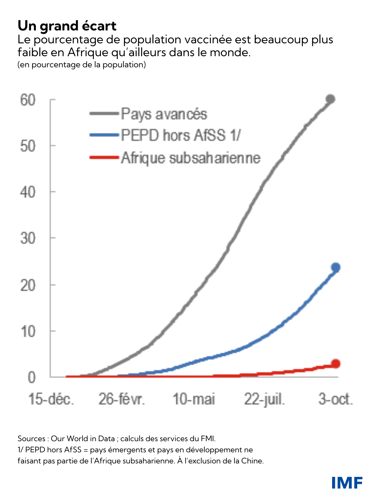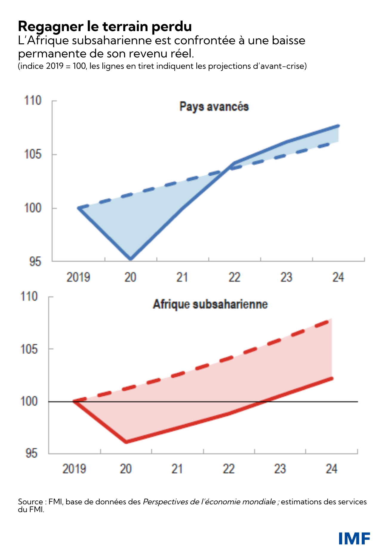 - La reprise attendue est plus lente que dans les autres régions, d’où un creusement des écarts. Les écarts de taux de croissance entre les régions devraient perdurer à moyen terme, dans le contexte de la persistance des disparités mondiales sur le plan de l’accès aux vaccins et des grandes différences de mesures publiques de soutien. Il est prévu que les pays avancés renoueront avec leur trajectoire de croissance d’avant la crise d’ici à 2023. En revanche, l’Afrique subsaharienne ne regagnera pas le terrain perdu dans un avenir proche. Il faudrait que la région enregistre une croissance deux fois plus rapide ces trois prochaines années pour faire jeu égal avec les résultats observés dans les pays avancés.