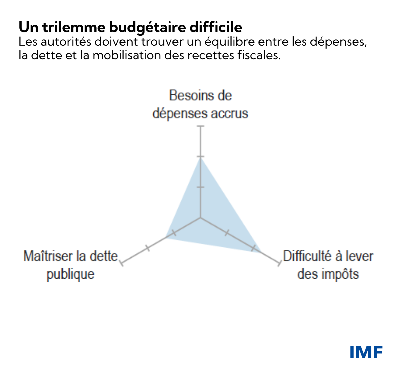 - Les pays d’Afrique subsaharienne sont confrontés à un trilemme budgétaire : ils doivent se livrer à un exercice d’équilibrage difficile entre les besoins urgents de dépenses de développement, la maîtrise de la dette publique et l’opposition grandissante à la mobilisation de recettes fiscales. Atteindre ces objectifs n’a jamais été chose aisée, mais la pandémie a encore compliqué la tâche des pays. Les besoins de dépenses de l’Afrique subsaharienne augmentent et deviennent urgents, sachant que la pandémie nuit à la santé, à l’emploi, à l’éducation, aux investissements en infrastructures et aux efforts de réduction de la pauvreté. Les changements climatiques amplifient les difficultés.