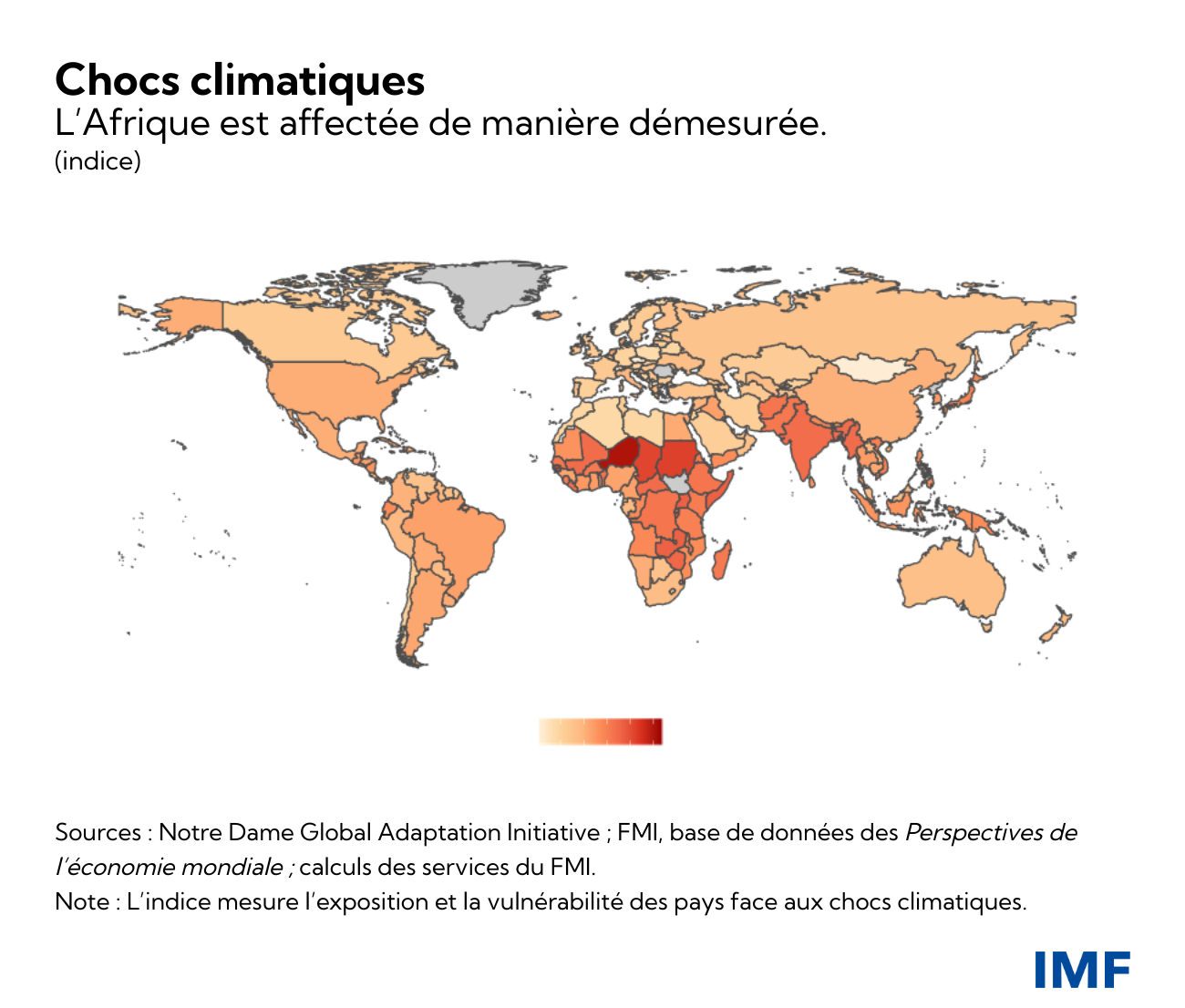 - L’Afrique subsaharienne est la région qui contribue le moins aux émissions de gaz à effet de serre, avec moins de 5 % du total mondial. Cependant, elle est peut-être la plus exposée aux chocs climatiques. Un tiers des sécheresses dans le monde se produisent déjà en Afrique subsaharienne. Compte tenu de sa dépendance à l’égard de l’agriculture pluviale, la région est particulièrement vulnérable. Les changements climatiques peuvent aussi avoir un effet multiplicateur sur les conflits et la fragilité, en exacerbant les tensions préexistantes, les carences en matière de gouvernance et d’autres problèmes socioéconomiques. Pour s’adapter aux changements climatiques et pour participer aux efforts d’atténuation à l’échelle mondiale, de nouveaux mécanismes solides de financement de l’action climatique seront nécessaires.