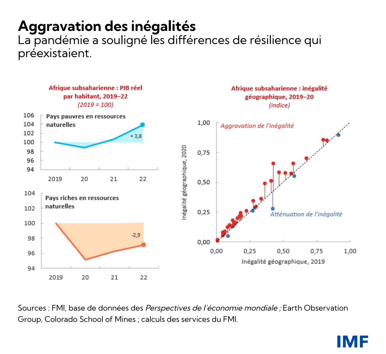 - La pandémie a aussi aggravé les disparités qui préexistaient entre les pays d’Afrique subsaharienne et à l’intérieur des pays. Même avant la pandémie, les pays pauvres en ressources naturelles qui présentent une structure économique diversifiée affichaient une croissance plus rapide que les pays riches en ressources naturelles. Cependant, la pandémie, qui a mis en évidence de grandes différences de résilience, a creusé cet écart.