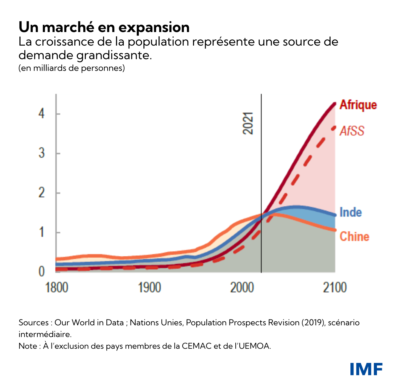 - Malgré les années difficiles qui se profilent, le potentiel de la région en tant que source de demande mondiale demeure intact. La population mondiale devrait croître de quelque 2 milliards de personnes ces trente prochaines années. Cette croissance aura lieu pour moitié en Afrique subsaharienne : selon les projections, la population de la région doit doubler pour passer d’environ 1 milliard à 2 milliards de personnes. Cela fait potentiellement de la région l’une des économies les plus dynamiques au monde, et l’un de ses marchés les plus importants.