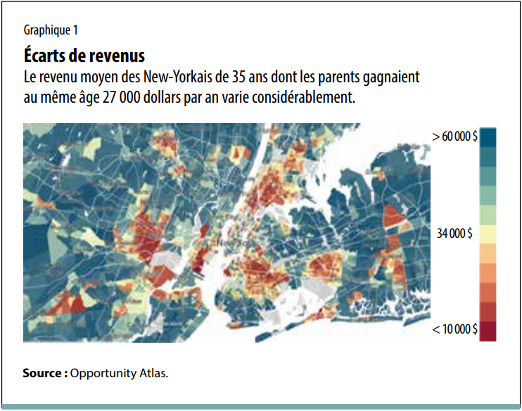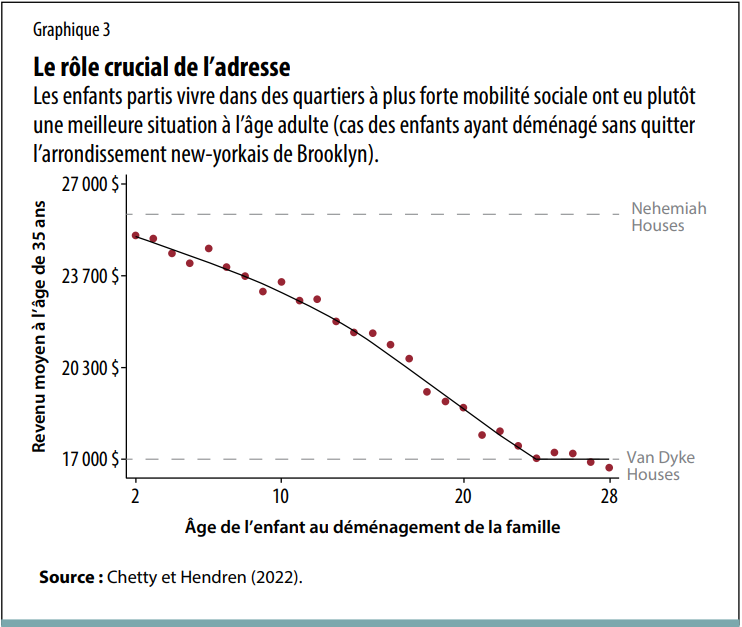 Il faut retenir que l’amélioration de l’environnement compte jusqu’à l’adolescence et au-delà; emménager dans un quartier plus favorable à 15 ans plutôt qu’à 20 reste assez avantageux. Ce n’est qu’après 23 ans que l’on cesse d’observer des effets sur le revenu. Les tendances sont comparables si l’on utilise les données d’observation concernant des familles de quartier pauvre choisies au hasard pour emménager dans un quartier prospère. En résumé, le quartier où l’on grandit détermine en partie la situation économique à l’âge adulte.