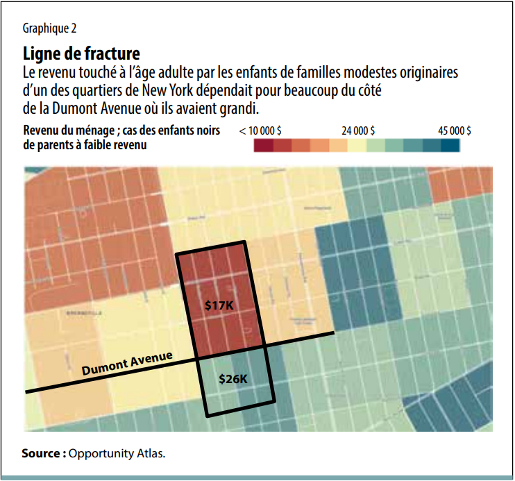 Le point de départ de notre analyse est le matériel de base qui a servi à établir l’Atlas des chances (Opportunity Atlas), un ensemble de données interactives que nous avons mis au point à partir de recensements et de déclarations fiscales afin de mesurer la mobilité ascendante dans chaque quartier aux États-Unis. Cet atlas illustre le fait que, dans certains quartiers, les enfants de familles à revenu faible connaissent une mobilité ascendante très importante, tandis que d’autres, pourtant issus de milieux comparables, tendent à rester prisonniers du piège de la pauvreté génération après génération. Le graphique 1, par exemple, montre le large éventail des revenus moyens que perçoivent une fois adultes les enfants de familles modestes qui grandissent à New York. Il ressort du graphique 2 que le revenu à l’âge adulte des enfants de familles à faible revenu du quartier de Brownsville (Brooklyn) variait considérablement selon qu’ils avaient grandi d’un côté ou de l’autre de Dumont Avenue.