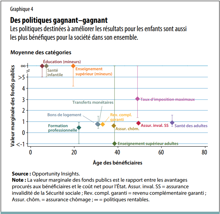 Le deuxième volet de notre analyse consiste à identifier les types de politiques qui améliorent le plus les perspectives économiques et le bien-être social. Nous avons étudié pour ce faire 133 politiques mises en œuvre au cours des 50 dernières années. Nous les avons comparées à l’aune d’une mesure standardisée, la valeur marginale des fonds publics (VMFP), qui est le rapport entre l’avantage qu’une politique procure aux bénéficiaires et son coût net pour l’État, y compris les effets budgétaires à long terme comme la baisse des dépenses sociales ou l’augmentation des recettes fiscales. Cette mesure nous permet de comparer l’efficacité de différents types de politiques (assurance sociale, impôts, transferts monétaires, éducation, formation professionnelle, transferts en nature, etc.) pour déterminer quelles sont celles qui influent le plus sur le bien-être social par dollar de dépense publique nette.