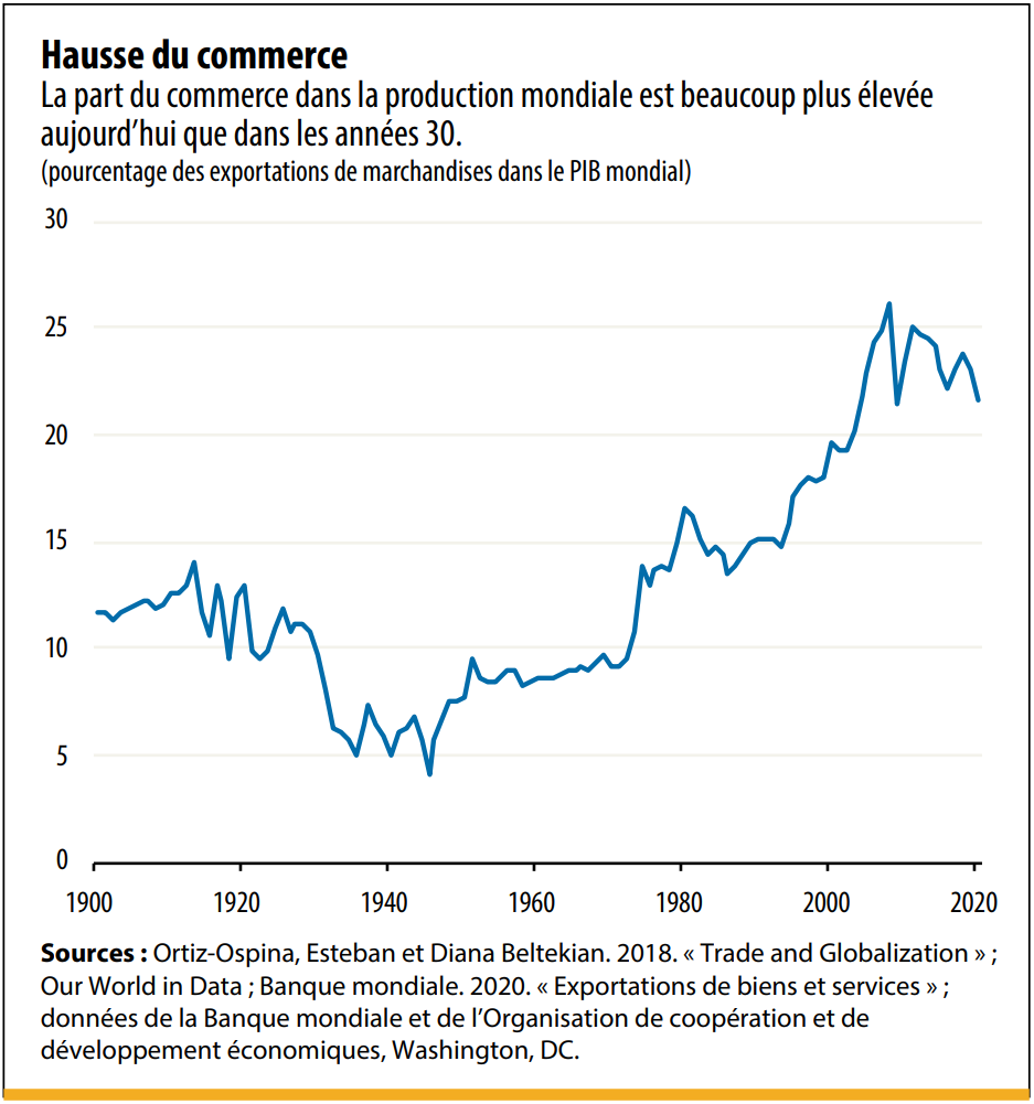 En revanche, le ratio commerce/PIB dans le monde est beaucoup plus élevé aujourd’hui (voir le graphique) et repose sur un système financier mondial basé sur le dollar et fortement intégré. Au lieu d’une déflation, les marchés du monde entier subissent une forte pression inflationniste. Les prix élevés des produits de base génèrent des recettes inespérées pour les pays exportateurs, tout en incitant les pays importateurs d’énergie à passer aux énergies renouvelables. Dans le même temps, compte tenu de l’intégration croissante des marchés financiers, les flux de capitaux en provenance des pays avancés sont indispensables à la croissance et à l’investissement dans les pays émergents et les pays en développement. L’économie mondiale d’aujourd’hui connaît de nets progrès grâce à cette interdépendance, car le commerce emploie une main-d’œuvre plus nombreuse, et les sources d’importations peuvent être beaucoup plus diverses. Toutefois, elle connaît également de plus grands facteurs de vulnérabilité, car les points de jonction entre les flux de produits de base, les transactions financières et la technologie peuvent être étouffés par les perturbations des chaînes d’approvisionnement ou ciblés par des sanctions gouvernementales.