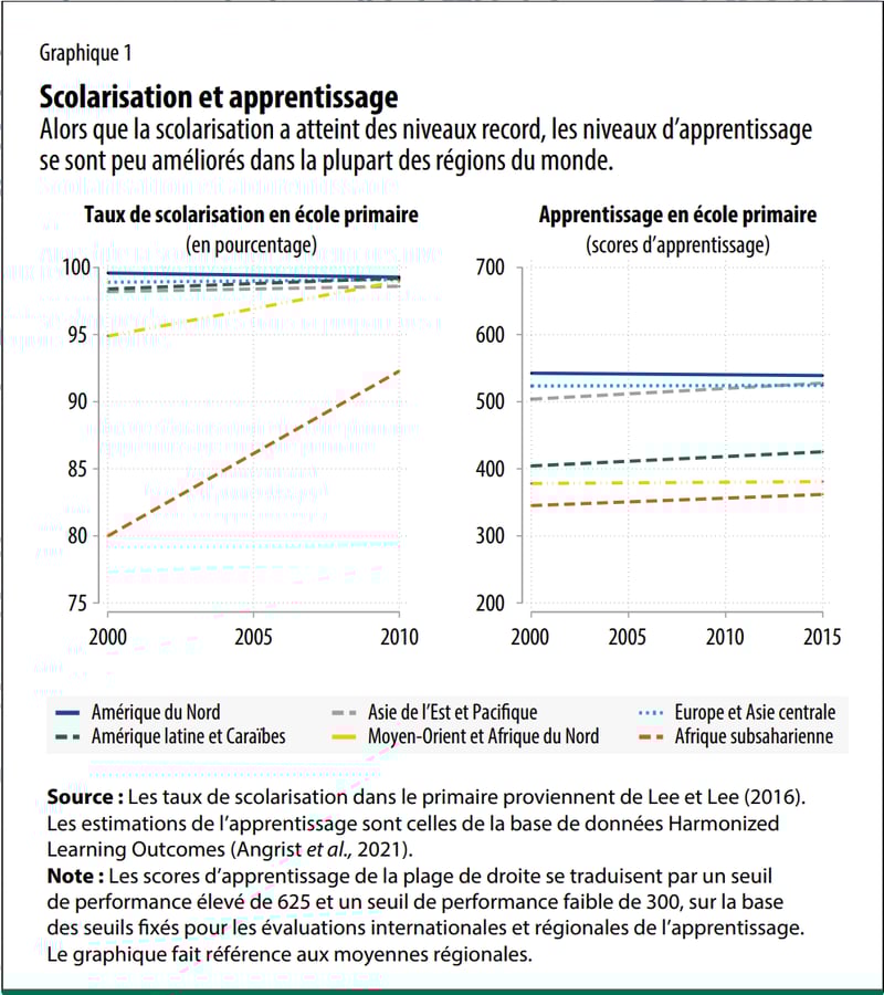 Les taux de scolarisation ont atteint des niveaux record. Selon une analyse des données de 164 pays, l’adulte moyen a suivi 7,6 années de scolarité en 2010, soit plus du double de la moyenne de 3,2 années en 1950. Au cours de la dernière décennie, les taux de scolarisation dans le primaire en Afrique subsaharienne sont passés de 80 % à 92,3 %. Pourtant, dans de nombreux pays, les niveaux d’apprentissage ne se sont guère améliorés (graphique 1).