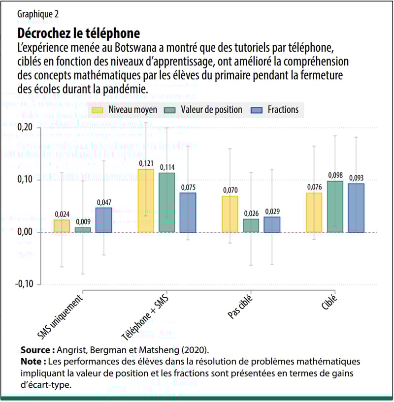 Cependant, l’apprentissage à distance n’a pas toujours été inefficace. Lors d’une expérience menée au Botswana, des SMS hebdomadaires associés à des tutoriels par téléphone à l’adresse des parents et de leurs enfants scolarisés en primaire ont amélioré l’apprentissage (graphique 2). Le programme couvrait les concepts de base du calcul et comprenait des tutoriels hebdomadaires de 20 minutes sur une période de 8 semaines. Cette initiative a fourni certaines des premières données expérimentales sur les approches visant à atténuer la perte d’apprentissage pendant la pandémie. Non seulement cette méthode a fonctionné, mais elle s’est avérée peu coûteuse et rentable, permettant d’obtenir l’équivalent de plus d’une année d’enseignement de haute qualité pour chaque montant de 100 dollars dépensé. Les SMS seuls n’étaient pas efficaces ; un certain niveau d’instruction directe par téléphone était essentiel.