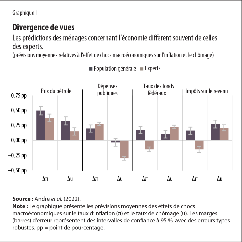 Dans un article récent, mes coauteurs et moi, nous sommes mis en quête de ces réponses (Andre et al., 2022). Nous avons effectué des sondages pour savoir ce que les gens pensaient de l’effet des chocs économiques sur le chômage et l’inflation. Entre 2019 et 2021, nous avons recueilli les réponses d’échantillons de 6 500 ménages américains globalement représentatifs. Par ailleurs, au cours de la même période, nous avons interrogé 1 500 experts, dont des fonctionnaires de banques centrales et d’institutions financières internationales, des professeurs, des doctorants et des économistes spécialistes du secteur financier. Pour les échantillons sondés pendant la pandémie de COVID-19, nous avons rectifié le questionnaire afin de nous assurer que les anticipations des répondants se rapportaient à un fonctionnement « normal » de l’économie, et non aux circonstances exceptionnelles de la pandémie.