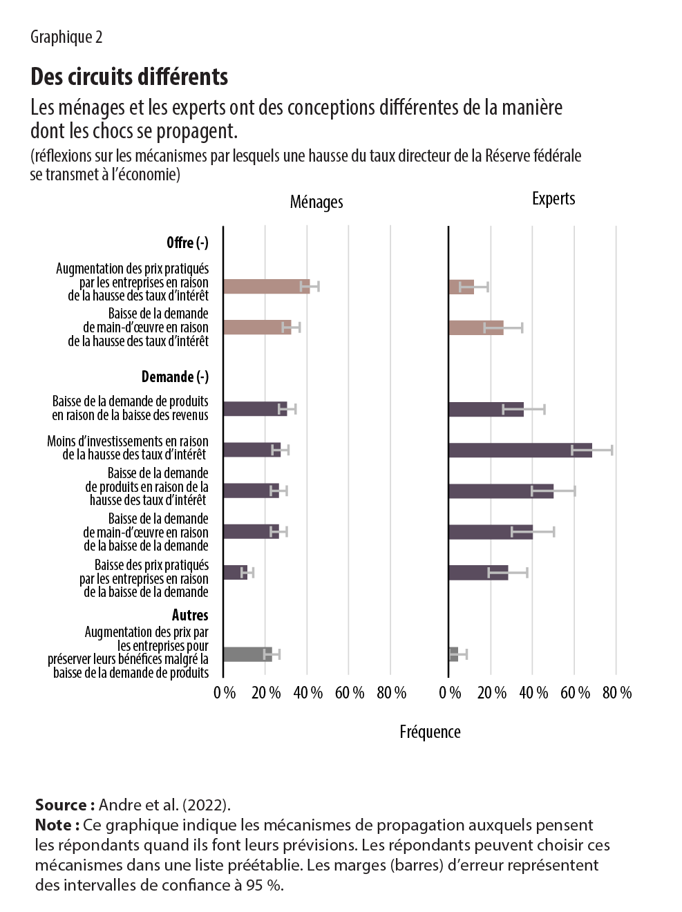 En outre, s’agissant des mécanismes de propagation des chocs, les ménages arrivent fréquemment à des conclusions très différentes de celles des experts, ce qui est une des raisons pour lesquelles leurs prédictions concernant certains chocs s’écartent autant de celles des experts. Par exemple, les ménages ont plus souvent pensé aux conséquences qu’une hausse des taux d’intérêt avait pour les entreprises qui empruntent des capitaux, parce que le renchérissement de ces capitaux est répercuté sur les consommateurs via les prix. De leur côté, la plupart des experts se sont référés au schéma classique de propagation des chocs par la demande, en vertu duquel l’inflation baisse quand les taux d’intérêt montent, car les consommateurs dépensent moins et épargnent plus (graphique 2).