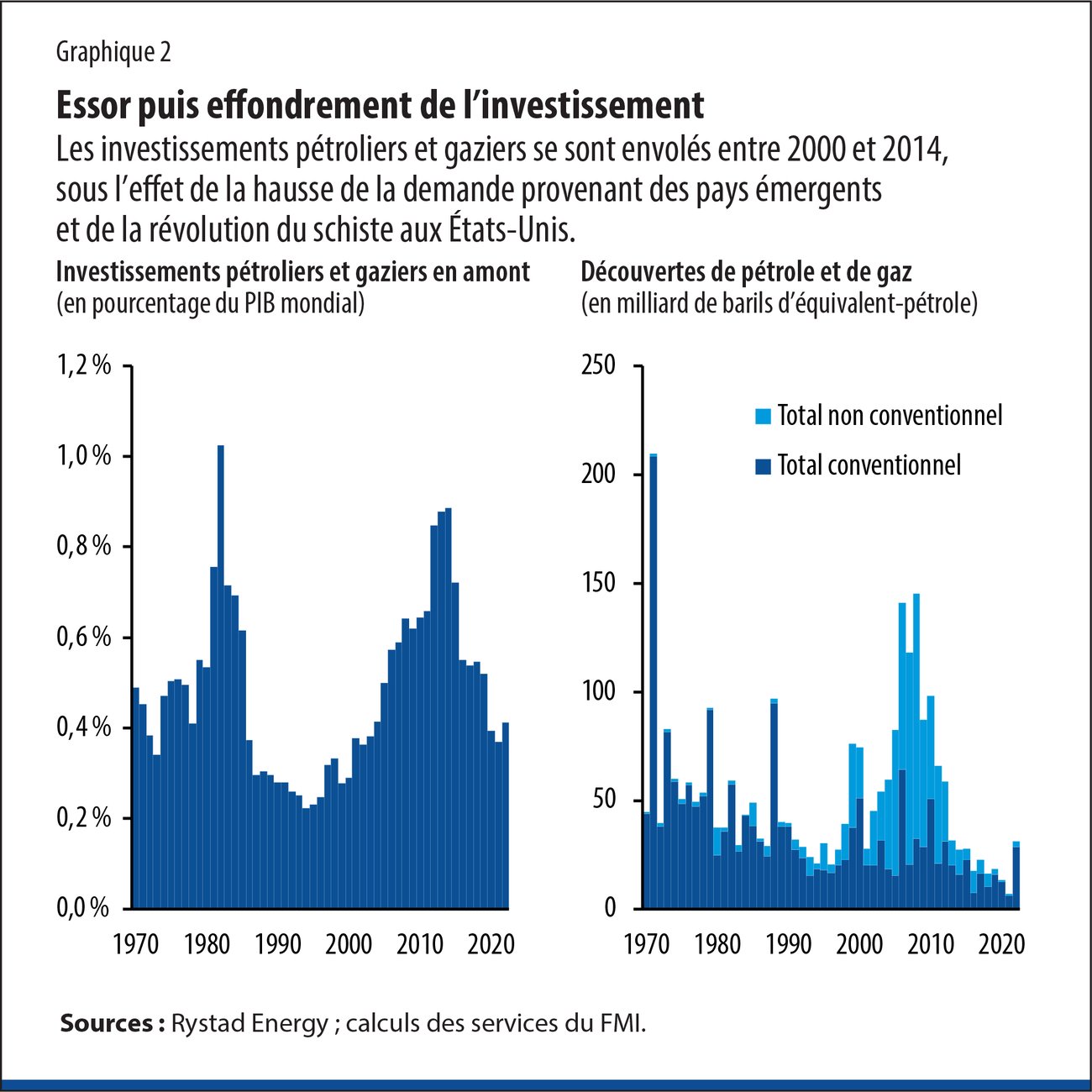 À partir du début du siècle environ, les investissements pétroliers et gaziers se sont envolés à l’échelle mondiale pour culminer en 2014 (graphique 2). L’essor de l’investissement a été provoqué par les prix élevés (à la suite de la vigueur de la demande émanant des pays émergents) et par la révolution de l’huile et du gaz de schiste aux États-Unis après l’innovation technologique en matière de fracturation dans les gisements d’hydrocarbures non conventionnels. Cela a été porteur de transformations profondes. Les États-Unis sont devenus un pays exportateur net d’hydrocarbures, qui a à peu près doublé sa production de pétrole et de gaz en 10 ans. Mais les phases d’expansion portent les ferments des récessions à venir. Dans ce cas, l’accroissement rapide de la production de pétrole aux États-Unis et la décision de l’Organisation des pays exportateurs de pétrole de défendre sa part de marché en augmentant sa production ont provoqué un effondrement des prix de l’énergie en 2014. En conséquence, les investissements pétroliers et gaziers ont diminué sensiblement à l’échelle mondiale.